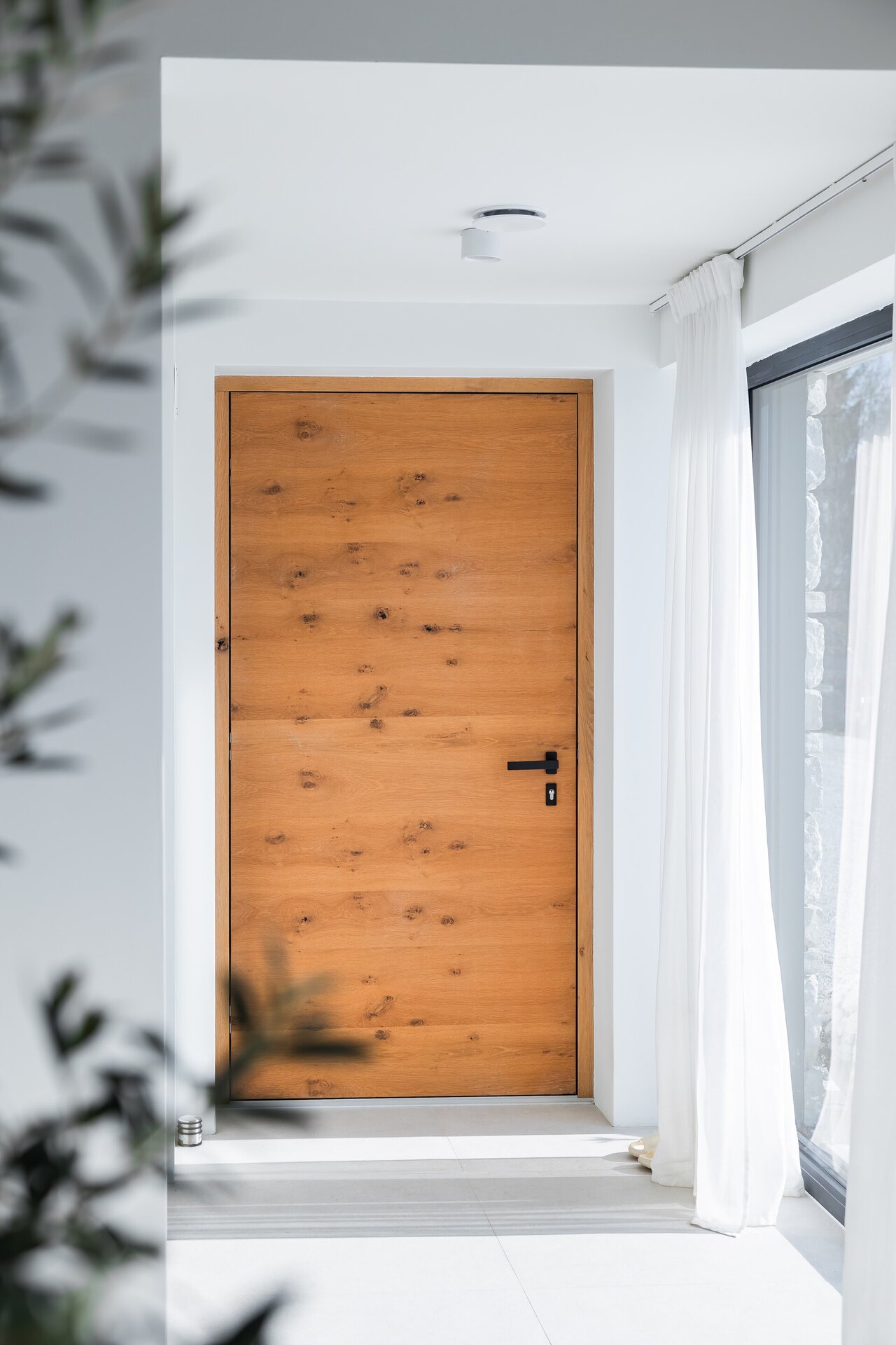 Glavni vhod dopolnjujejo lesena vhodna vrata AJM. Odklepajo se s pomočjo prstnega odtisa, ki je nameščen na ročaju vrat.