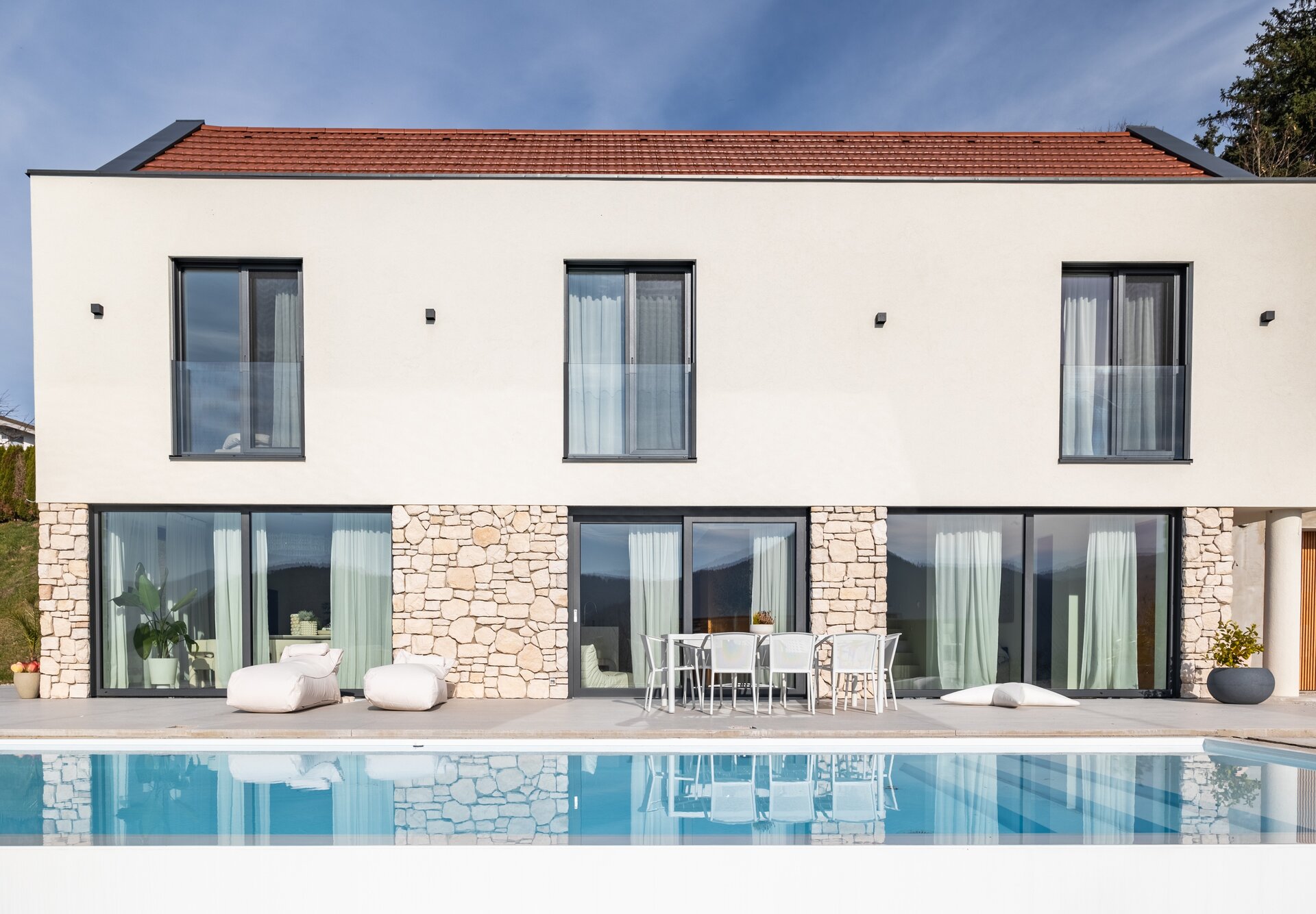 Za sodobno oblikovano hišo sta izbrala PVC-ALU okna AJM, ki z zunanjo aluminijasto masko zagotavljajo večjo odpornost, minimalno vzdrževanje in elegantno arhitekturno podobo. Troslojna zasteklitev skrbi za visoko energijsko učinkovitost in odlično zvočno izolacijo – pomembno v domu z velikimi steklenimi površinami in odprtim tlorisom.