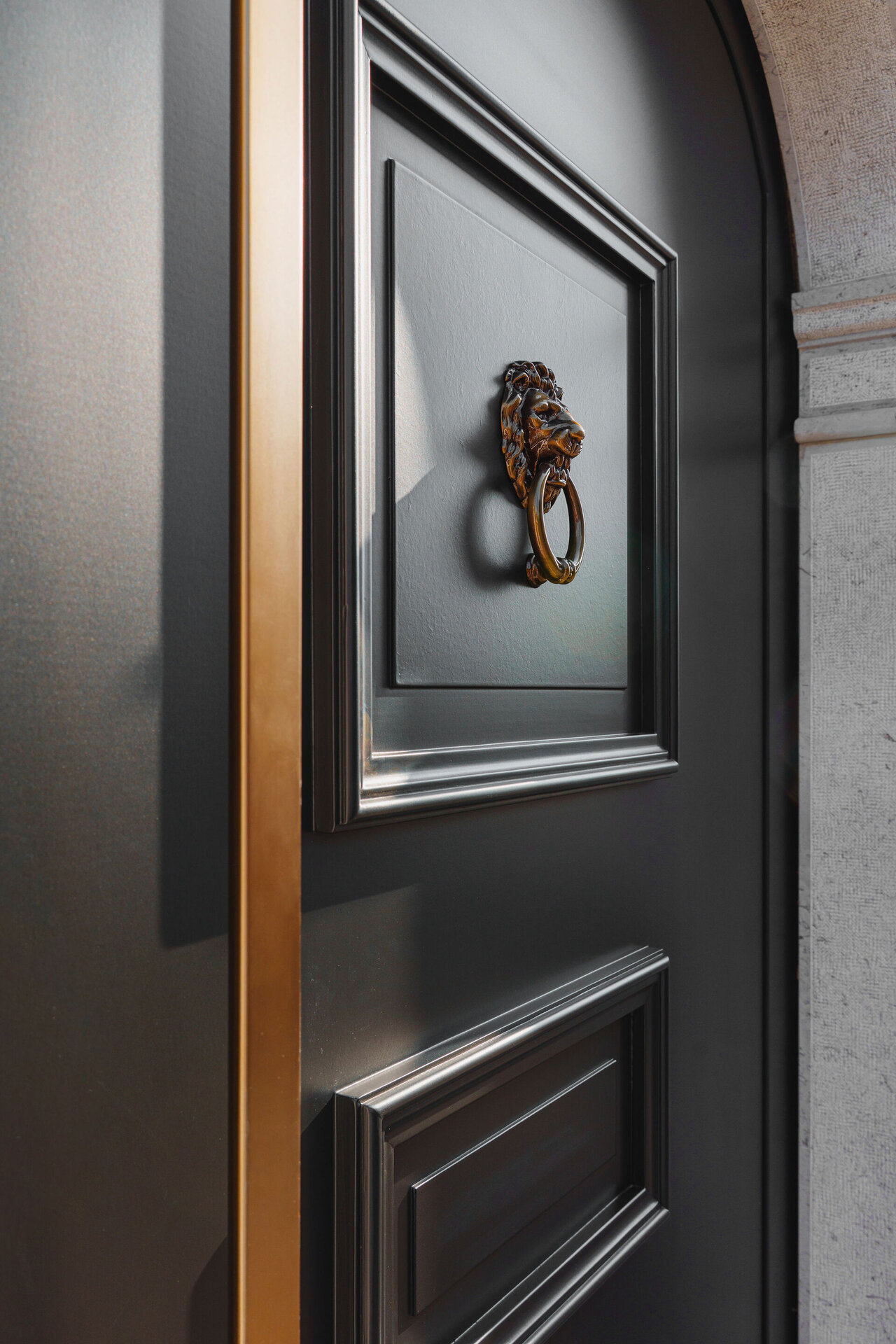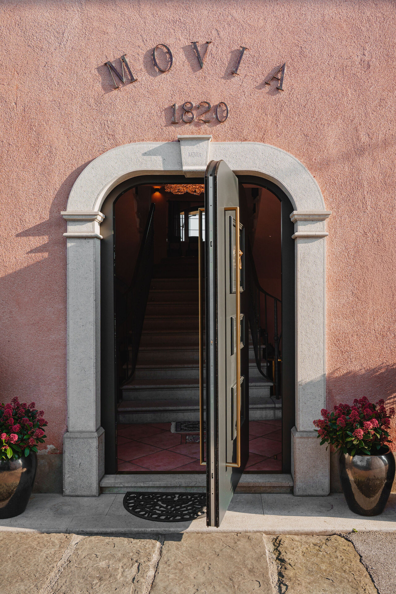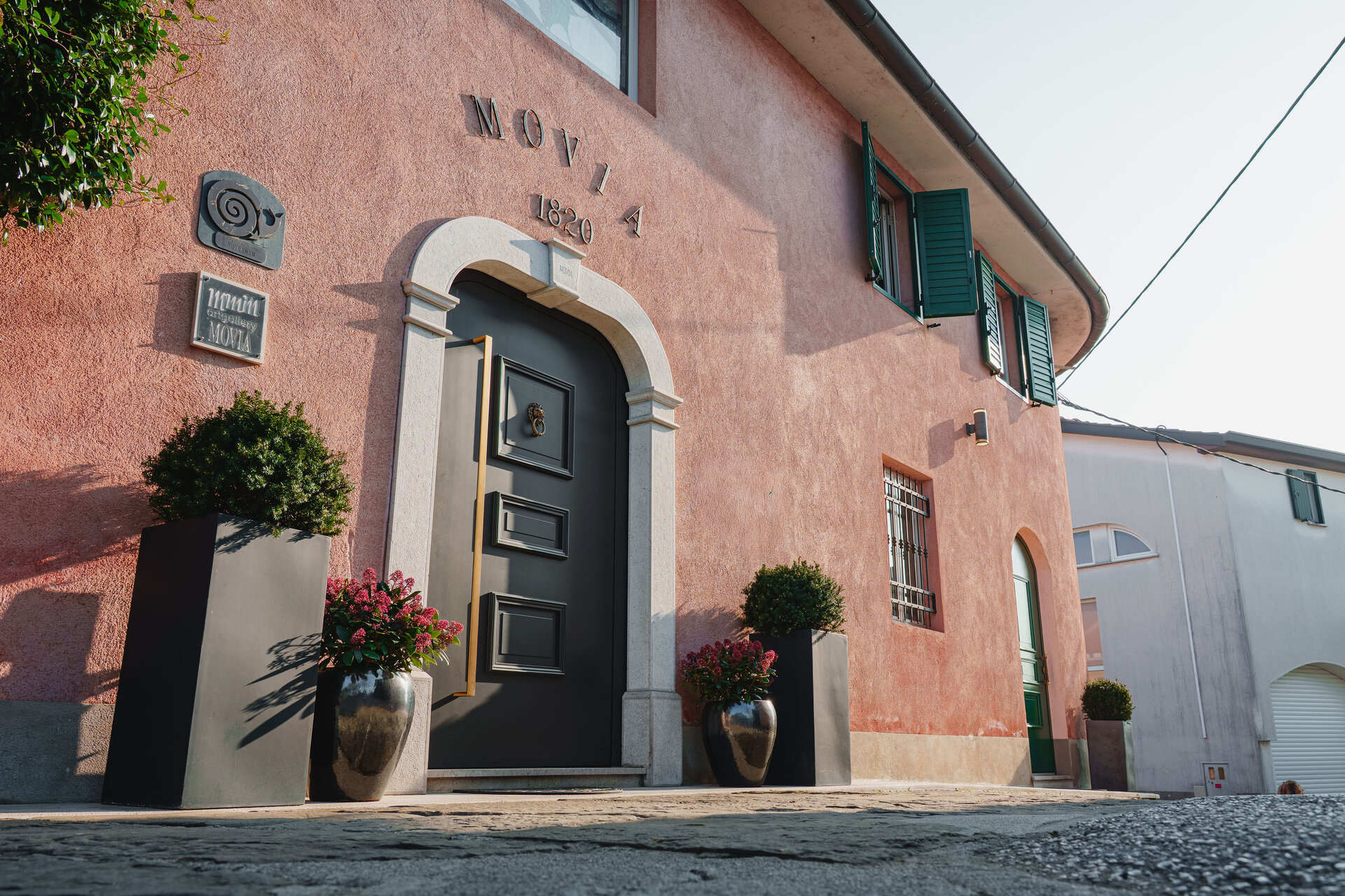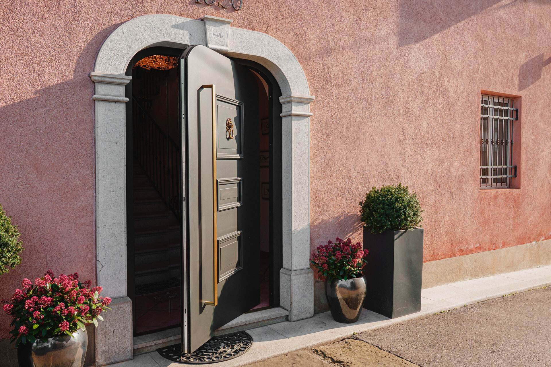 Vhod v objekt zaznamujejo lesena pivot vhodna vrata, ki s svojo višino, masivnostjo in prefinjenimi detajli ustvarjajo izrazito glamurozen prvi vtis. Temna površina vrat v kombinaciji z elegantnim, podolgovatim ročajem v kovinskem tonu deluje prestižno in brezčasno, pivot odpiranje pa dodatno poudari sodoben značaj in lahkotnost uporabe.